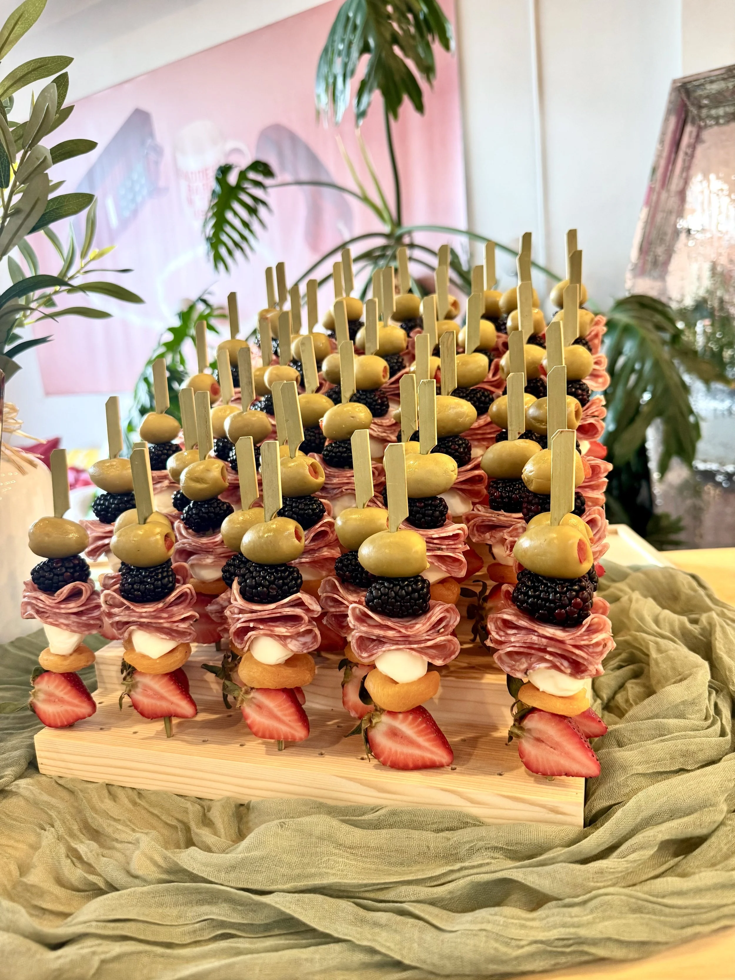 Signature Skewer: A curated pairing of premium cured meat, artisan cheese, and seasonal accompaniments like fresh fruit or olives.